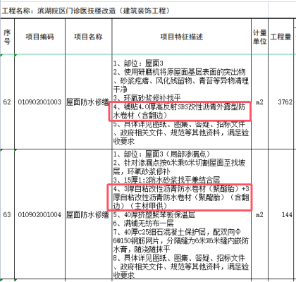 1.“滨湖院区门诊医技楼改造”单位工程的清单第62条“屋面防水修缮”中的“4、铺贴4.0厚高反射SBS改性沥青外露型防水卷材(含翻边)”未写“主材甲供”,并且在6.23补遗第二条招标需求之3.1材料、设备主材价格表中未列出名称及工程量,请核实。下图为第62条清单与第63条清单特征内容对比。