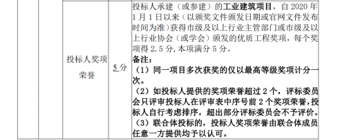 5.商务文件详细评审投标人奖项荣誉:投标人承建(或参建)的工业建筑项目,自2020年1月1日以来(以颁奖文件颁发日期或官网文件发布时间为准)获得市级及以上行业主管部门或市级及以上行业协会(或学会)颁发的优质工程奖项,每个奖项得2.5分,本项满分5分。