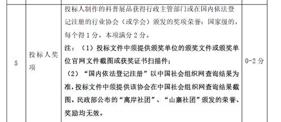 理由:如此大规模的项目,本评分项中仅仅对一个科普展品获奖给予得分,具有明显倾向性,涉嫌排斥或限制其他潜在投标人,不符合法律相关规定。