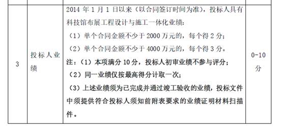 建议:更改“科技馆布展工程设计与施工一体化业绩”为“展览馆或博物馆或科技馆布展工程设计或施工业绩”做为投标人业绩评分标准。