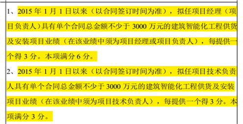 3)由于3000万以上规模的智能化工程其施工周期非常长,本评分办法要求同一个项目经理在5年内完成3个3000万以上的业绩才能得满分,此条并不符合当下市场实际情况。尤其针对中小型企业更不可能满足,本条以不合理的条件限制或者排斥潜在投标人,存在一定的排他性。