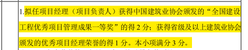 删除“拟任项目经理(项目负责人)获得中国建筑业协会颁发的“全国建设工程优秀项目管理成果一等奖”的得2分;获得省级及以上建筑业协会颁发的优秀项目经理荣誉的得1 分。本小项满分3分”的要求。