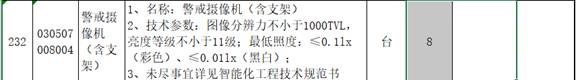 答:警戒摄像机(含支架)数量改为28台,具体参数及安装要求详见图纸及技术规范书要求。控制价修改如下: