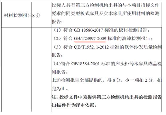 | 合肥市滨湖新区房屋租赁有限公司康睦嘉服务式公寓家具采购项目招标文件补疑1 2020BFHAZ02457 第一部分:投标人疑问答复内容 1. 招标文件 第42 页【材料检测报告】(8分),第(2)项中要求提供符合GB/T 23997-2009标准的油漆检测报告。国家质量技术监督部门及行业通用标准为更权威、更严格的国家强制标准GB 18581-2009,请问提供符合GB 18581-2009标准的油漆检测报告是否可以得分?