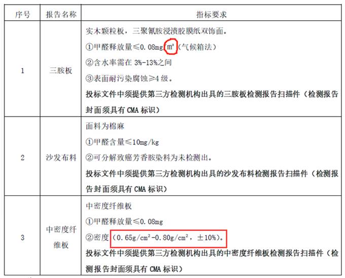 事实及法律依据: GB/T表示为推荐性标准,而GB则为必须执行的强制性标准。GB国家标准是指由国家标准化主管机构批准发布,对全国经济、技术发展有重大意义,且在全国范围内统一的标准。GB/T推荐性国标是指生产、交换、使用等方面,通过经济手段调节而自愿采用的一类标准,又称自愿标准。这类标准任何单位都有权决定是否采用,违反这类标准,不承担经济或法律方面的责任。从以上可以看出,GB标准优于GB/T标准。 检测报告属于企业自愿性检测,国家没有强制要求检测报告必须为某一种检测标准,所以检测标准每家会有所不同。油漆的国家标准是GB 18581-2009,GB/T 23997-2009只是推荐标准。同一类产品有很多检测标准,GB或GB/T 均应予以认可。 修改建议:(2)符合GB 18581-2009或GB/T 23997-2009标准的油漆检测报告。 (1)、(3)、(4)项提供国GB或GB/T 标准的检测报告均予以认可。 答:(2)符合GB 18581-2009或GB/T 23997-2009标准的油漆检测报告均可,其他按照招标文件执行。 2. 招标文件 第60 页,三胺板和中密度纤维板的甲醛释放量单位mg/m2有误,是否可以调整为mg/m3?中密度纤维板的密度单位g/cm2有误,是否可以调整为g/cm3? 事实及法律依据:按照气候箱法,甲醛释放量的单位为mg/m3;中密度纤维板的密度单位为g/cm3 修改建议: