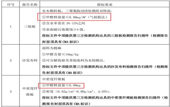依据国家标准气候箱法的甲醛释放量的单位应该是mg/m³(立方米),而不是㎡(平方米),请明确。 答:详见变更部分。 6. 本项目采购需求较大、品种较多,清单格式为PDF,无法直接虎算价格。请发一份表格形式的清单,便于投标人报价和制作投标文件。 答:已重新上传EXECL版清单(与PDF版本内容一致),请各投标人自行下载。 7. 本项目要求投标人提供配置方案,但却没有给出平面设计图、也没有给出各个房间的大小尺寸及房型布局图,因此无法提供方案。麻烦请给出相应的施工图纸及各个房间的大小尺寸及房型布局图。 答:已重新上传,请各投标人自行下载。 第二部分:变更部分 本项目招标文件“第五章供货要求”中“三、技术性能指标”原内容为:“