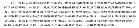 5.招标文件明确写明,投标人承诺在本项目中选用产品品牌档次均不低于推荐品牌;中标后,我公司无条件接受招标人对我公司投标方案及投标产品的审查,如经核查认定我公司所投产品不满足招标文件要求,我公司将从本表的推荐品牌中选取符合招标文件技术参数要求的产品提供给招标人确认,经招标人确认后方可供货安装。且我公司承诺投标报价不增加,如有虚假,或我公司后期未按承诺执行的,招标人有权终止合同,并由我公司承担由此产生的一切相关责任和后果。