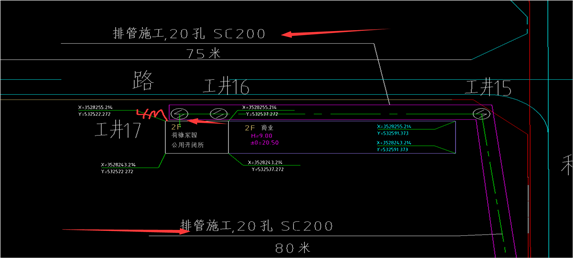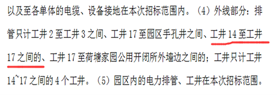 ①清单中SC200排管20孔 的断面量只有159米,图纸中如果加上工井16至工井17之间的排管断面量不只159米,如果不加上工井16至工井17之间的排管断面量是159米(80+75+4),请问工井16至工井17之间的排管在本次招标范围内吗?如果在的话请明确工井16至工井17之间的排管是多少米?