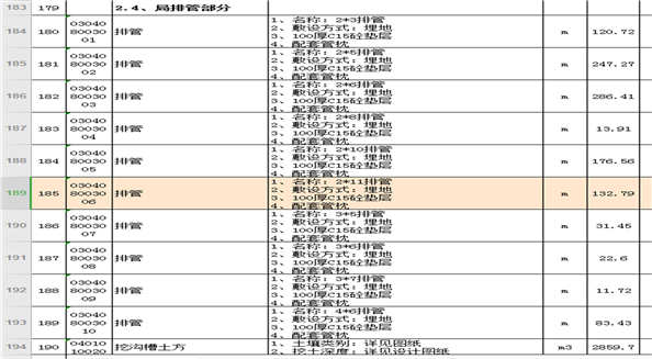答:清单项第180至第189项为电力排管混凝土包管,电力排管在清单第133项至第148项。