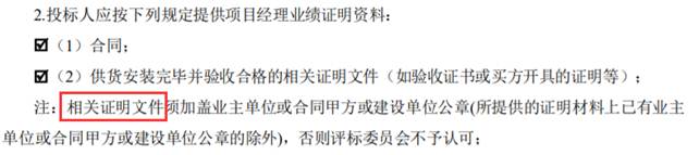 两处描述不完全一致。请明确项目经理业绩证明材料要求中的“相关证明文件”是否为“供货安装完毕并验收合格的相关证明文件”。