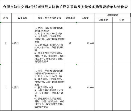 一、合肥市轨道交通3号线南延线人防防护设备采购及安装设备购置费清单与计价表