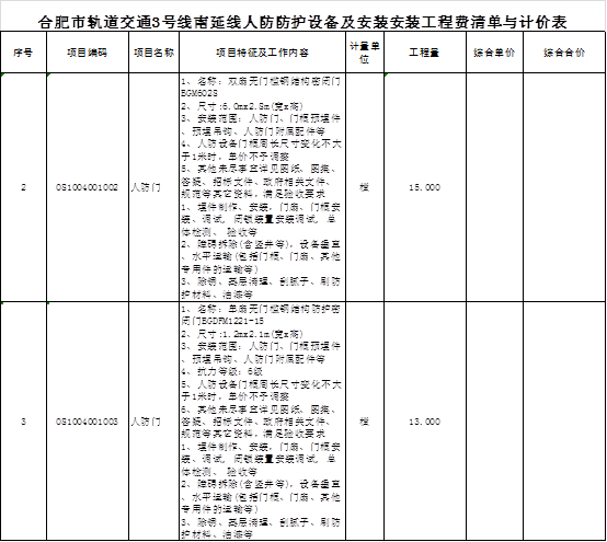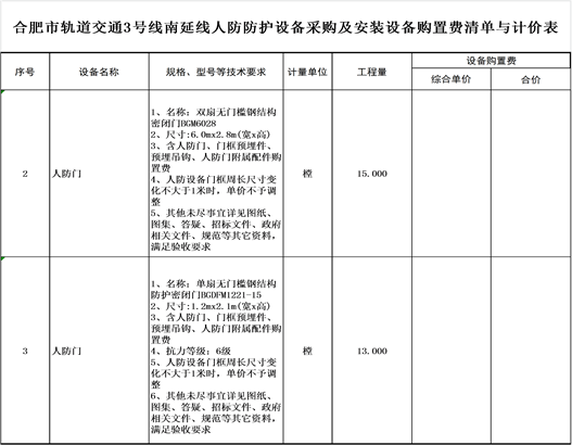 合肥市轨道交通3号线南延线人防防护设备采购及安装设备购置费清单与计价表和安装工程费清单与计价表第2项清单子目和第3项清单子目工程量有误,进行以下调整,其他不变,特此说明。
