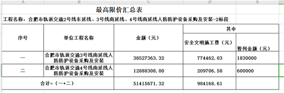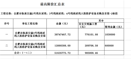 三、合肥市轨道交通2号线东延线、3号线南延线、4号线南延线人防防护设备采购及安装-2标段最高限价汇总表