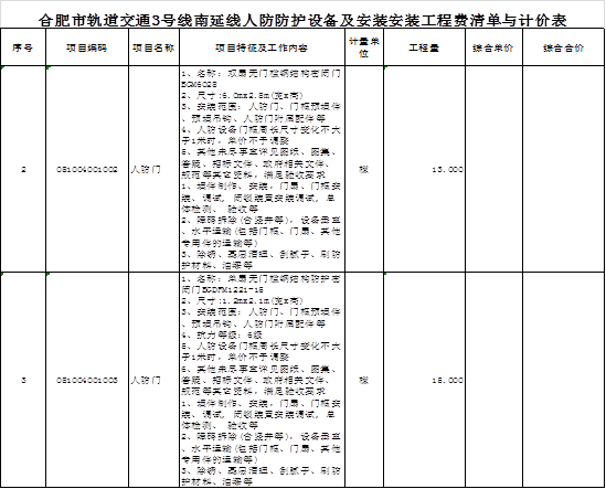 二、合肥市轨道交通3号线南延线人防防护设备及安装安装工程费清单与计价表