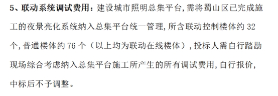 16、《蜀山区楼宇夜景亮化提升二期工程》清单中“夜景亮化系统调试”包含“联控控制系统调试”如图3及《蜀山区楼宇夜景亮化提升二期工程招标补疑6.9》中“联动系统调试费用”图4约定了数量但未明确具体的楼宇名称,请明确纳入总集平台的相关楼宇名称?