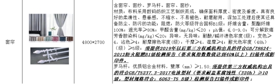3.家具清单中人才公寓项窗帘材质要求——“窗帘、窗纱:材质:布料采用数码纺织工艺制织而成,确保面料厚度、密度及垂度。具有良好的柔滑性、悬垂感,不缩水、不易褪色、耐磨耐用,深加工处理后使其还具备防尘、防污的功能;阻燃:防火等级符合国标B1级;纤维含量:聚酯纤维100%;遮光率≥80%;甲醛含量(mg/kg)≤20;ph值:4.0-9.0;可分解致癌芳香胺染料(mg/kg)≤20;异味:无异味;耐酸/碱汗渍色牢度(级):变色≥4,沾色≥4;耐摩擦色牢度(级):干摩≥4,湿摩≥4;耐光色牢度(48h)(级)≥5级;须提供2019年以后第三方权威机构出具的符合GB/T8624-2012防火阻燃B1级检测报告(要求氧指数数值达到40%以上)扫描件或影印件。罗马杆:优质铝合金材料,壁厚(mm)≥1.50;须提供第三方权威机构出具的符合GB/T5237.3-2017电泳型材(要求耐盐雾腐蚀性(320h)≥10级,型材规格符合:6063-T5B级)检测报告扫描件或影印件;”