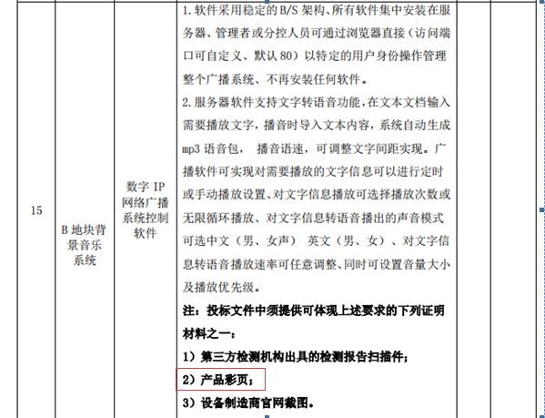 52.招标文件第五章(四)性能指标响应表中,数字IP网络广播系统控制软件参数:1.软件采用稳定的 B/S 架构、所有软件集中安装在服 务器、管理者或分控人员可通过浏览器直接(访问端 口可自定义、默认 80) 以特定的用户身份操作管理 整个广播系统、不再安装任何软件。2.服务器软件支持文字转语音功能, 在文本文档输入 需要播放文字, 播音时导入文本内容, 系统自动生成 mp3 语音包, 播音语速, 可调整文字间距实现。广 播软件可实现对需要播放的文字信息可以进行定时或手动播放设置、对文字信息播放可选择播放次数或 无限循环播放、对文字信息转语音播出的声音模式可选中文(男、女声)英文(男、女)、对文字信息转语音播放速率可任意调整、同时可设置音量大小及播放优先级。