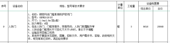 “合肥市轨道交通6号线一期、7号线一期、8号线一期工程人防防护设备采购及安装2标段-设备购置费”单位工程工程量清单第9项,综合单价由8616元调整为29823元。具体修改如下: