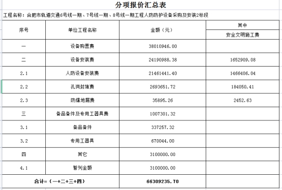 “合肥市轨道交通6号线一期、7号线一期、8号线一期工程人防防护设备采购及安装2标段汇总表”修改如下: