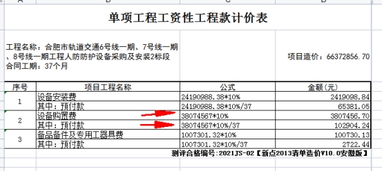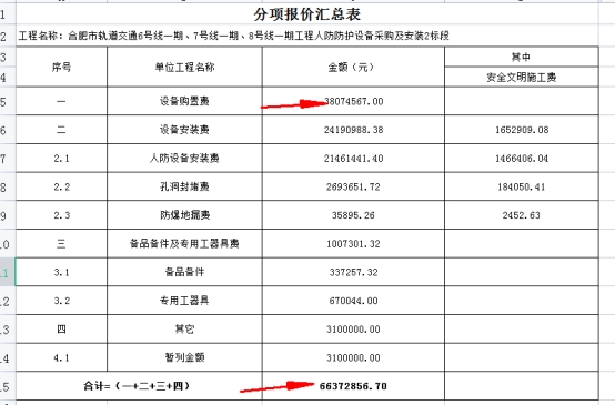5、综上所述,“合肥市轨道交通6号线一期、7号线一期、8号线一期工程人防防护设备采购及安装2标-设备购置费”单位工程造价由38010946.00元调整为38074567.00元。本项目全费用清单控制总价由66309235.70元调整为66372856.70元(大写:陆仟陆佰叁拾柒万贰仟捌佰伍拾陆元柒角整)。