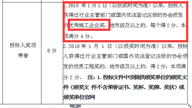 答:投标人须提供行业主管部门或国内依法登记注册的协会颁发的优秀施工企业奖,其它投标人奖项荣誉不满足招标文件第三章评标办法“投标人奖项荣誉”中第1项的评分要求。
