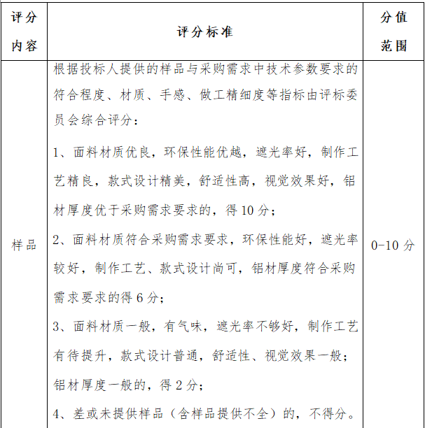 2 、评标方法中“样品”项评分标准及分值范围变更为: