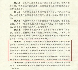 质疑内容:国人部发【2003】39号文第十条规定,通过计算机专业技术资格(水平)考试,并获得相应级别计算机专业资格(水平)证书的人员,取得高级资格可聘任高级工程师(文件截图附后)。