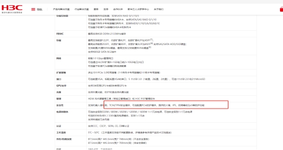 3.新华三官网服务器参数:支持机箱入侵检测,TCM/TPM安全模块,可选配置PCIe防护模块,提供防火墙、IPS、防病毒和QoS等防护功能