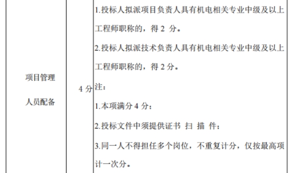 1.投标人拟派项目负责人具有机电工程相关专业或电力工程相关专业或输变电工程相关专业中级及以上工程师职称的,得2 分。2.投标人拟派技术负责人具有机电工程相关专业或电力工程相关专业或输变电工程相关专业中级及以上工程师职称的,得2分。注: