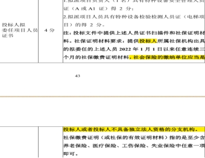 1.拟派项目负责人(1名)具有特种设备安全管理人员证(A 或 A1 证)得 2 分;2.拟派项目人员具有特种设备检验检测人员证(电梯项目)的得 2 分。注:投标文件中提供上述人员证书扫描件和社保证明材料。社保证明材料要求:提供投标人或制造商所属社保机构出具的拟委任的员上述人员2022年1月1日以来任意连续三个月的社保缴费证明材料,社会保险的缴纳单位应当是投标人或者制造商不具备独立法人资格的分支机构。社保缴费证明(或社保的有效证明材料)指的是至少含养老保险、医疗保险、工伤保险、失业保险中任意一项即可。
