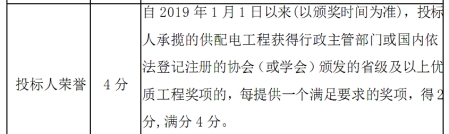 6.招标文件第52页投标人荣誉要求:自2019年1月1日以来(以颁奖时间为准),投标人承揽的供配电工程获得行政主管部门或国内依法登记注册的协会(或学会)颁发的省级及以上优质工程奖项的,每提供一个满足要求的奖项,得2分;满分4分;