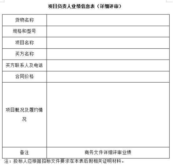 回复:招标文件第三章评标办法-“2.2.2(2)商务文件评分标准”,投标人可在第六章投标文件格式-“七、商务文件详细评审资料”中对照商务文件详细评审要求,自行提供相关资料。投标人可使用投标文件制作工具在本项目“商务文件详细评审资料”节点中对应制作上传。“投标人荣誉”和“技术负责人资格”无固定格式要求,“项目负责人业绩”格式如下: