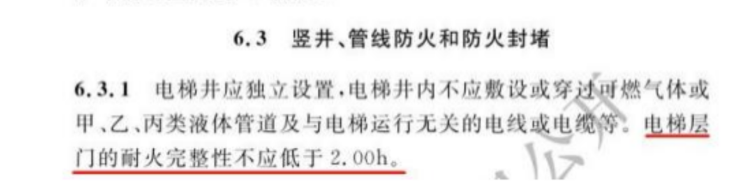 回复:按规范要求,电梯层门的耐火完整性不低于2.00h。