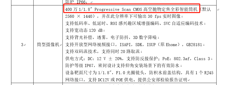 疑问3.用户需求书1.15主要设备一览表-1.5.14视频监控系统中的“3.筒型摄像机”参数要求: