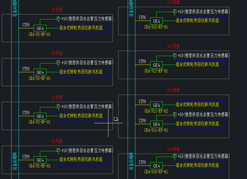 而在《中安创谷三期节能自控系统图》图内包含了(N1~5#、N12~17#、M2~9#)的新风机组(热回收机组)控制: