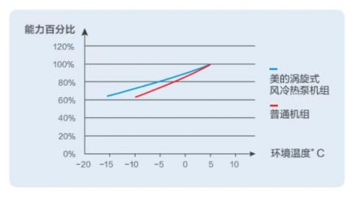 疑问1:依据现有清单和图纸,综合得出的情况是要求该风冷涡旋热泵机组的制热量应在-12℃时达到400KW,但通常主机设备厂家公开发行的样册上的名义制热量都是在室外干/湿球温度在7/6℃的情况下体现的,而在-12℃时衰减基本达到60%-70%之间,以美的为例: