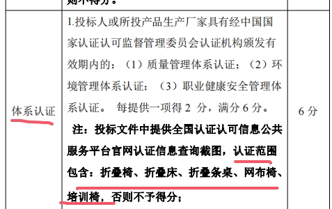 建议合理修改:删除(1)质量管理体系认证;(2)环境管理体系认证;(3)职业健康安全管理体系认证、中国环境标志产品认证(即十环)、CQC中国环保产品认证证书、家具产品环保卫士认证证书、低VOCS家具产品认证证书、绿色产品认证证书中要求提供具体的产品内容和认证范围。更符合投标人之间公平竞争。