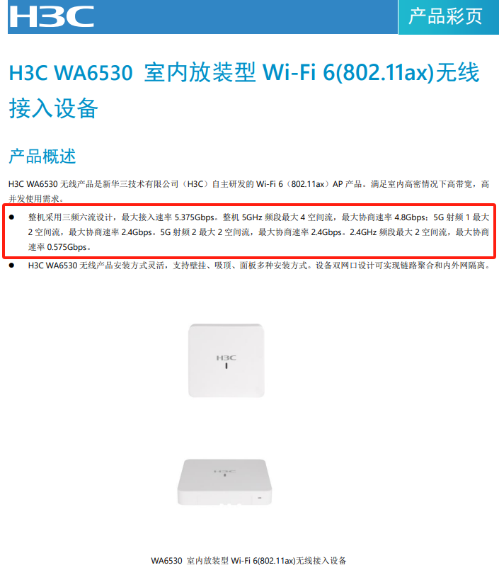 “1.采用三频6流设计,支持802.11ax模式,支持MU-MIMO;4.内置智能天线,支持内置物联网BLE5.1/RFID/Zigbee,提供官网截图证明;