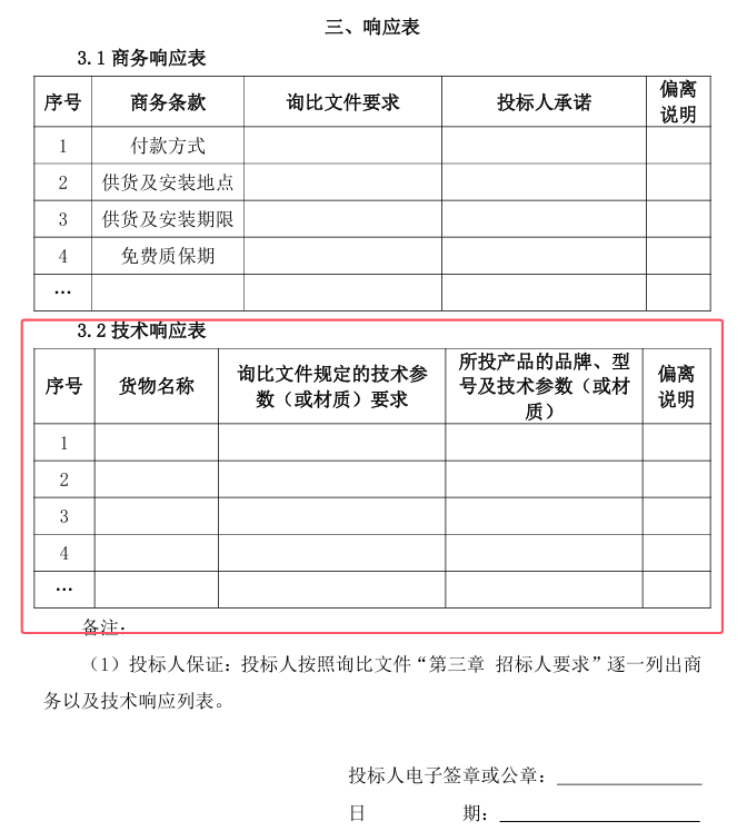 回复:询比文件中第六章投标文件格式—“三、响应表的3.2技术响应表”中,“询比文件规定的技术参数(或材质)要求”填写已发布的采购需求清单中“城改云庐府(高新区讯飞小镇保障性住房项目)售楼部和样板间软装及采购布置需求清单最高投标限价汇总表”中的规格和材质说明内容,“所投产品的品牌、型号及技术参数(或材质)”填写所投产品的规格和材质说明即可。投标人未在技术响应表中列明偏离情况的条款视为默认响应。
