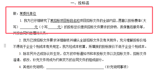 投标文件中报价文件-投标函中写“我方已仔细研究了某招标项目标段名称项目招标文件的全部内容,愿意以投标费率(大写) 元(小写 元)的投标总价提供招标文件要求的货物、质保售后服务等,并按合同约定履行义务”,或“我方已仔细研究了某招标项目标段名称项目招标文件的全部内容,愿意以投标总价(大写) 元(小写 元)的投标总价提供招标文件要求的货物、质保售后服务等,并按合同约定履行义务”,均予以认可。