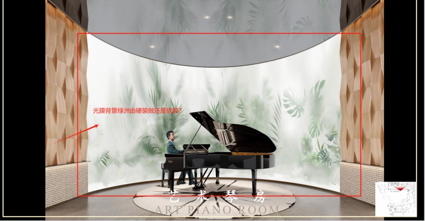 (2)钢琴后面的光膜背景是软装做绿植还是硬装做贴膜?