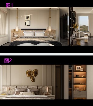 答:上图中图片1为主卧意向,主卧意向图中柜体非硬装实施,图片2为次卧意向。