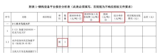 “附表 1-钢构设备平台报价分析表”中原材、加工等单位为元/吨,总价=材料综合单价*数量+项目现场安装费,但表格给定的单位为套,数量为1,无法按照“总价=材料综合单价*数量+项目现场安装费”计算,请问是否可以修改单位及数量,还是说不用修改,把吨位体现在项目特征即可,请明确如何操作。