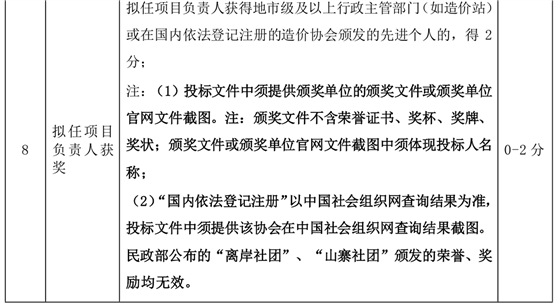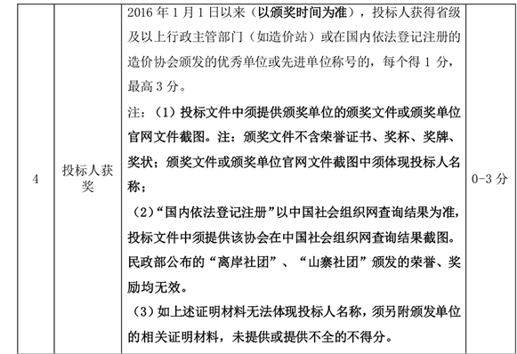 2016年1月1日以来(以颁奖时间为准),投标人获得省级及以上行政主管部门(如造价站)或在国内依法登记注册的造价协会颁发的优秀单位或先进单位称号的,每个得1分,最高3分。 注:(1)投标文件中须提供颁奖单位的颁奖文件或颁奖单位官网文件截图。注:颁奖文件不含荣誉证书、奖杯、奖牌、奖状;颁奖文件或颁奖单位官网文件截图中须体现投标人名称; (2)“国内依法登记注册”以中国社会组织网查询结果为准,投标文件中须提供该协会在中国社会组织网查询结果截图。民政部公布的“离岸社团”、“山寨社团”颁发的荣誉、奖励均无效。 (3)如上述证明材料无法体现投标人名称,须另附颁发单位的相关证明材料,未提供或提供不全的不得分。 |