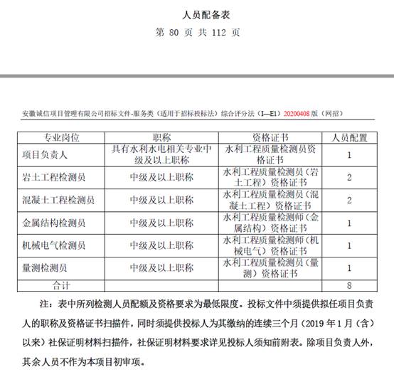 注:表中所列检测人员配额及资格要求为最低限度。投标文件中须提供拟任项目负责人的职称及资格证书扫描件,同时须提供投标人为其缴纳的连续三个月(20191月(含)以来)社保证明材料扫描件,社保证明材料要求详见投标人须知前附表。除项目负责人外,其余人员不作为本项目初审项