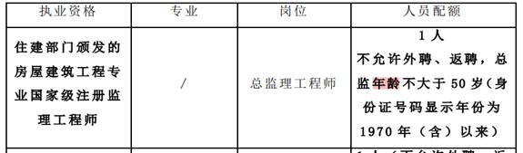 1.招标文件P31第10条“对投标单位人员的配备要求”总监理工程师年龄限定为不大于50岁,而注册监理工程师执业年限国家相关规定为65周岁,此条件设置是否合理?