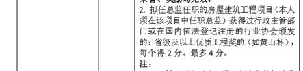 由于本项目争创“全国建设工程项目施工安全生产标准化工地”,为了更好的为本项目服务,我公司认为省级及以上安全文明标准化工地同样能够突出总监的管理职能和荣誉成果,建议将本条改成:“拟派总监任职的房屋建筑工程项目(本人须在该项目中任职总监)获行政主管部门或在国内依法登记注册的行业协会颁发的:省级及以上优质工程奖(黄山杯)或省级及以上安全文明标准化工地的,每个得 2 分,最多得4分。”
