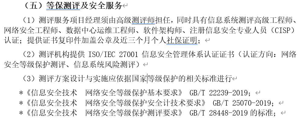 5、原文要求:关于“等保测评及安全服务是否由第三方进行测评”技术规范书描述不明确