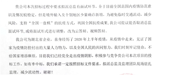 建议:我司为省外企业,此项目拟任总监目前仍在省外,现疫情期间,应减少人员流动,故建议取消总监参加项目开标时答辩。