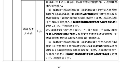 3.招标文件评分标准第47页项目负责人业绩要求:自2011年1月1日以来(以合同签订时间为准),3项已开通运营的非全自动运行线路业绩,以及1项已开通运营的全自动运行线路业绩,再加上初审业绩,总共需要5个项目负责人业绩得满分,此得分项要求过高,建议修改为符合2项已开通运营的非全自动运行线路和1项已开通运营的全自动运行线路业绩的得满分。
